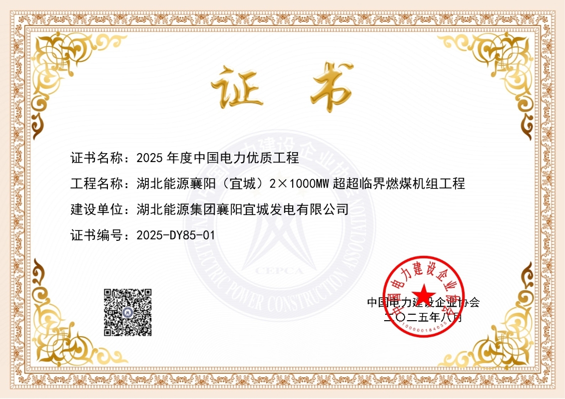 近日,中國電力建設企業協會正式公布2025年電力優質工程獎評選結果,湖北能源襄陽(宜城)2×1000MW超超臨界燃煤機組工程獲評“2025年中國電力優質工程”,標志著湖北能源在電力工程建設領域實現創優成果零的突破。